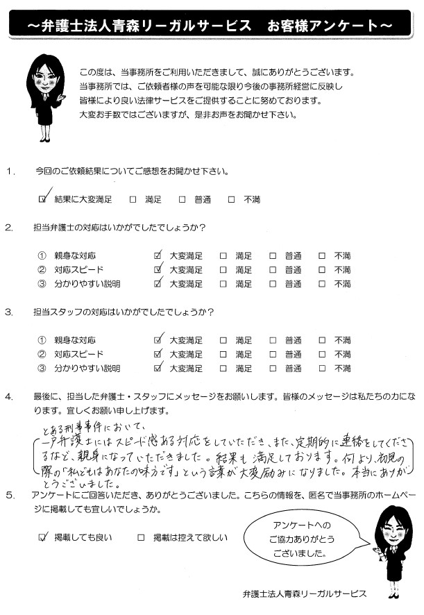 とある刑事事件において、一戸弁護士にはスピード感ある対応をしていただき、また、定期的に連絡をしてくださるなど、親身になっていただきました。